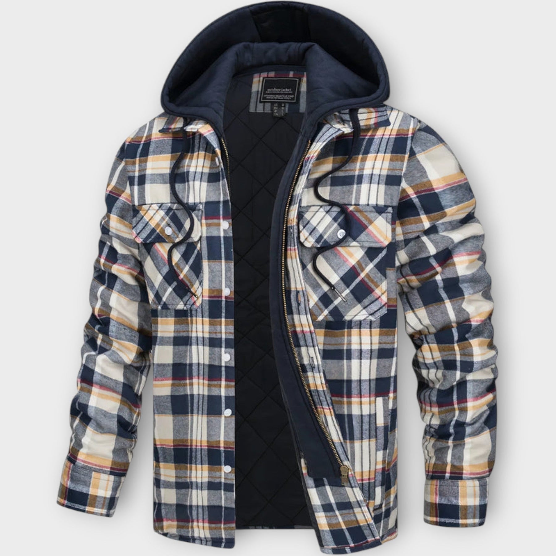 This jacket features a bold check pattern with dual front chest pockets and a snap-button outer closure over a full zip-up quilted inner layer. A soft, attached hood with adjustable drawstrings adds extra warmth and comfort. The relaxed fit and rugged design make it a practical go-to for casual outings and chilly days.