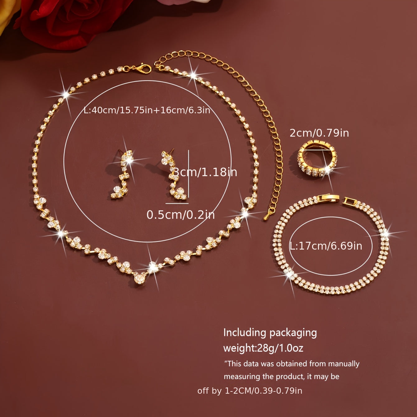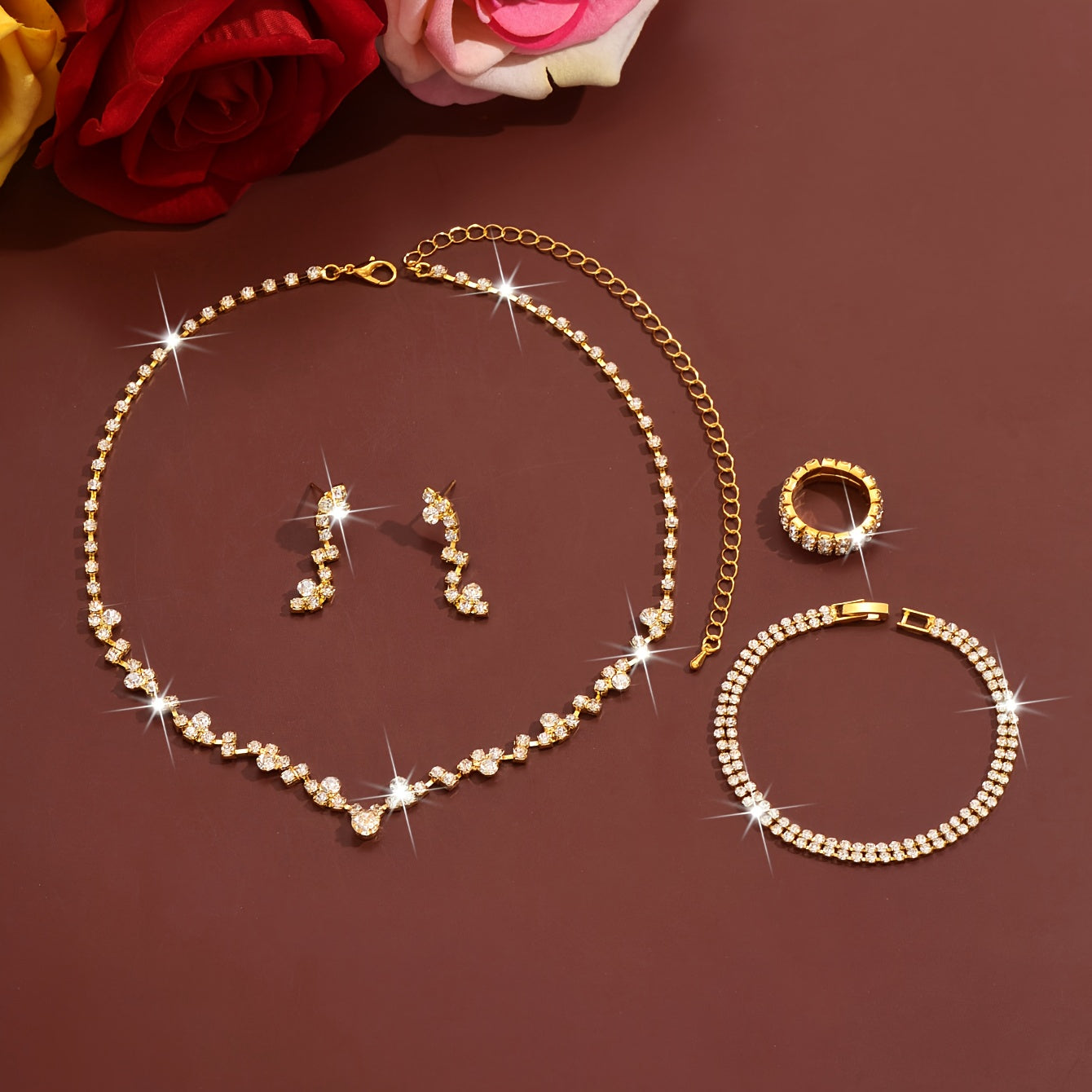 This dazzling five-piece set includes a drop necklace, bracelet, earrings, and two matching rings, each adorned with shimmering floral-shaped stones. The intricate design features delicate clusters of sparkle set in a warm-toned metal, creating a luxurious and cohesive look. Perfect for weddings, galas, or special celebrations, it instantly adds refined brilliance to any outfit.