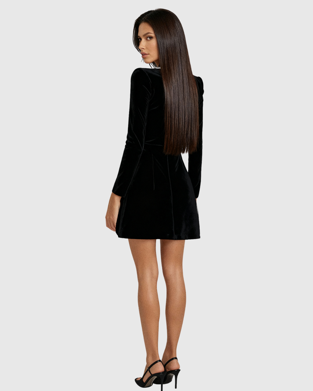 This striking mini dress features a rich velvet texture and a flattering square neckline adorned with delicate crystal floral embellishments. Long fitted sleeves and a softly pleated skirt create a balanced, elegant silhouette. Perfect for holiday parties or formal dinners, this dress blends timeless sophistication with a modern touch of sparkle.